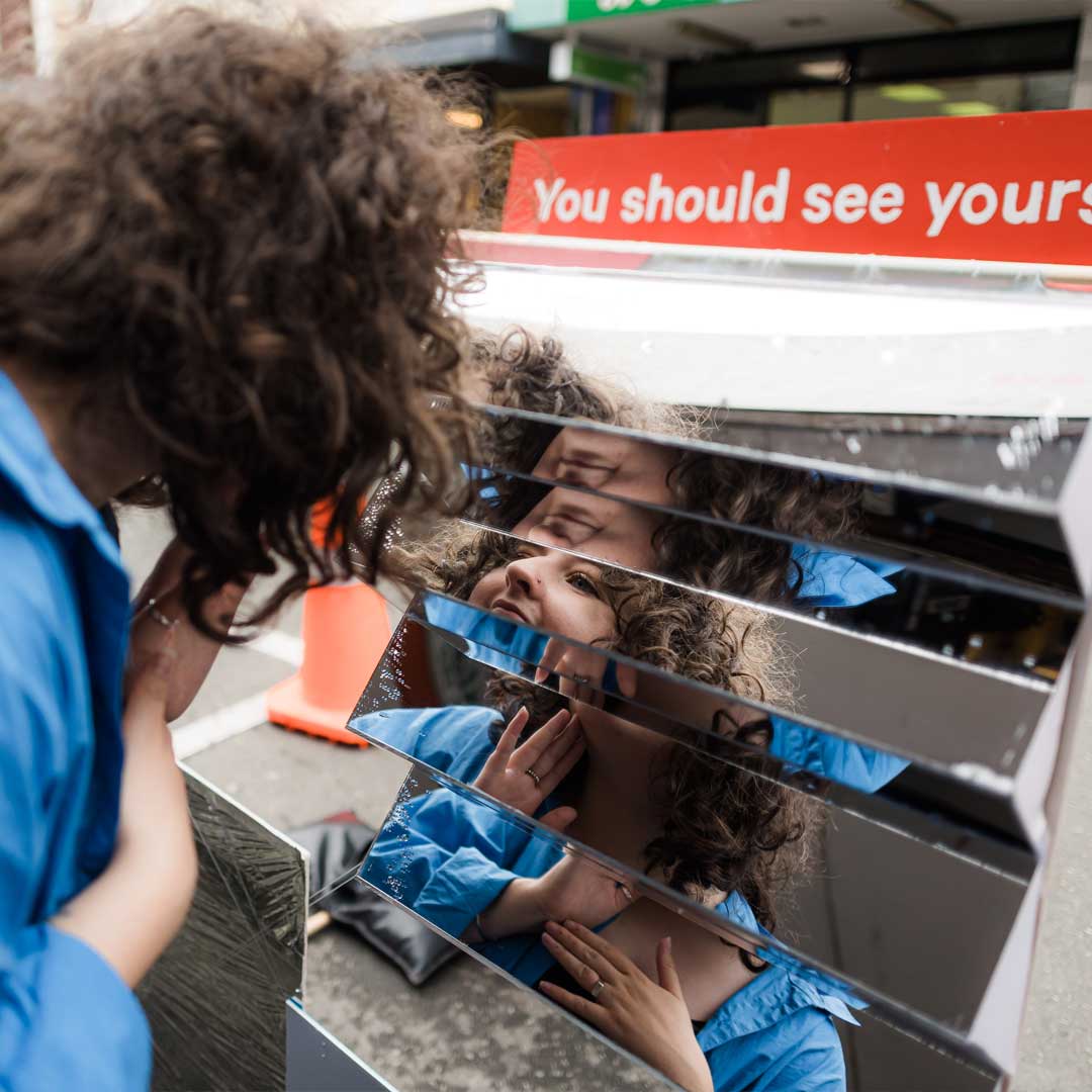 A pop-up partition, made from recyled materials, for Parking Day 2023 that saw participants reflecting on representation, identity and belonging in our city spaces.